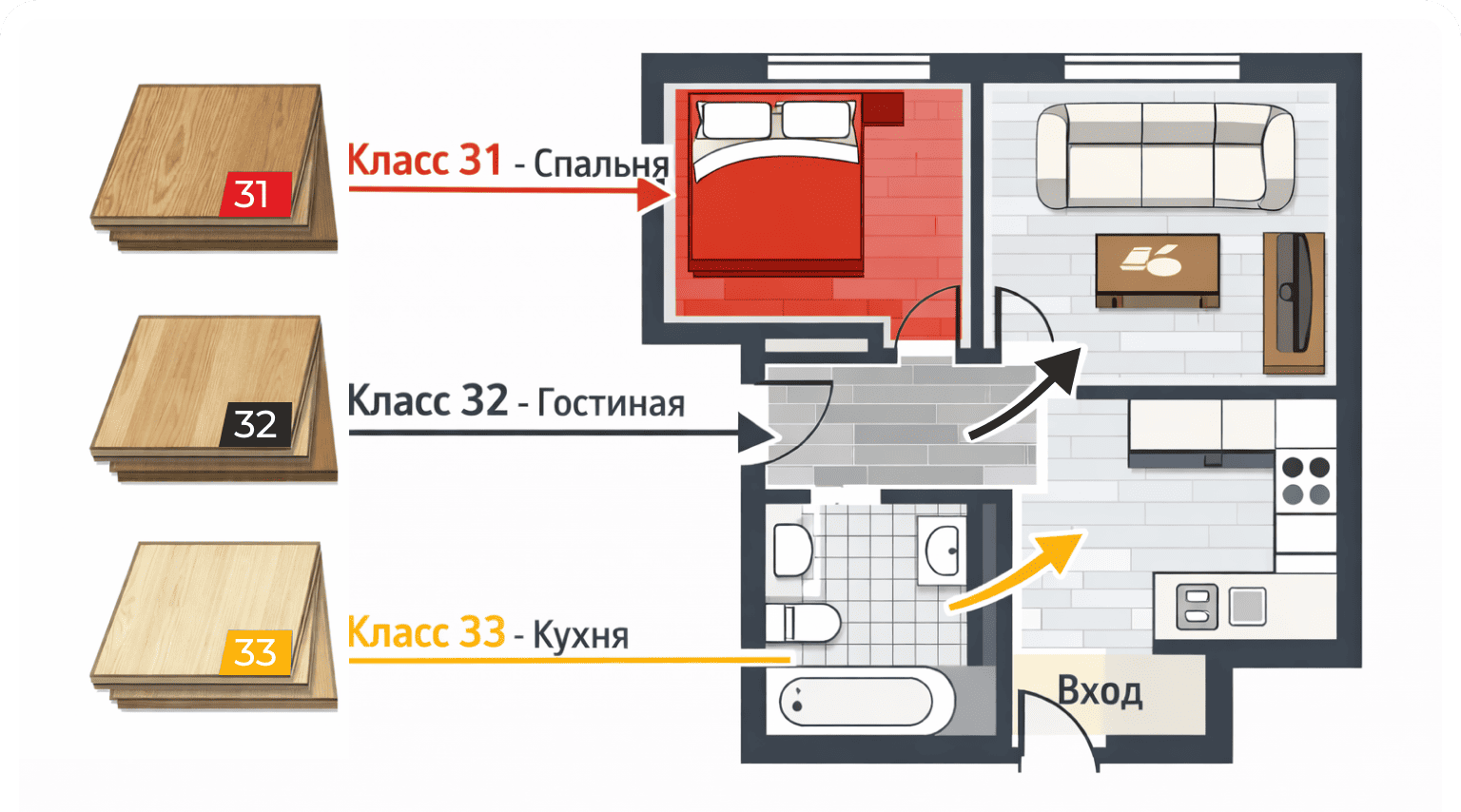 Вот простая шпаргалка, какой класс ламината лучше для каждой комнаты: